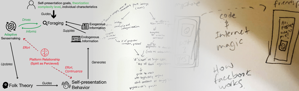 Folk theorization is the process by which we form, test, and update our folk theories. It’s best to look at it as a loop in which we continually make sense of changing systems by taking in new information, adjusting our theories, and seeing how our newly-adjusted theories perform when we try to use them. One such loop is represented above, showing you how folk theorization works during self-presentation on social media platforms. Note that we take in both endogenous information (e.g., looking at the platform ourselves and running tests on it) and exogenous information (e.g., articles about the platform, anecdotes from friends), which we interpret through the lens of our own goals, theorization complexity level, and individual characteristics, which then gets integrated into an adaptive sense making process, which results in an updated folk theory, which motivates behavior, which produces feedback that starts another iterative folk theorization loop.